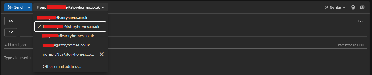 Click New email Then click on the From dropdown box --> Other email address...